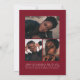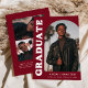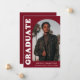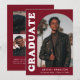 Faire-part de remise des diplômes élégant et branché avec la photo du diplômé sur le devant avec un cadre photo en arc décalé. "Graduate" est affiché en caractères gras blancs rétro sur un arrière - plan bordeaux/marron. Personnalisez l'avant du faire-part de remise de diplômes en photo en ajoutant le nom du diplômé, son école et son année de remise de diplômes. La carte s'inverse pour afficher 3 photos supplémentaires avec espace pour le texte personnalisé comme les futurs plans de collège, plans de carrière, détails de la fête de remise des diplômes, etc. Le faire-part de burgundy est parfait pour les diplômés du secondaire et du collège.