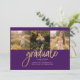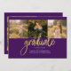 Annonce de diplôme 4 Photos Script Violet Or pour la promotion de 2025. Personnalisez facilement ceci en changeant le texte et en remplaçant les photos par les vôtres. Une façon moderne et tendance d'annoncer votre diplôme cette année !