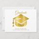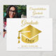 Avec une chic casquette de graduation en or, cette carte de diplôme moderne peut être personnalisée avec les détails de votre célébration et une photo spéciale au verso. Conçu par Thisisnotme©