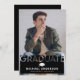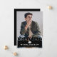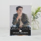 Carte de faire-part de graduation noire tendance avec une photo du diplômé, un tableau de bord et un modèle de texte moderne facile à personnaliser.