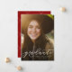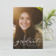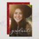 Un diplômé en écriture simple et ludique est assis au bas d'une photo verticale. Le texte personnalisé comprend la place pour le nom du diplômé ainsi que les détails de l'école et de l'année. Le dossier rouge classique a un simple motif de grille, et la couleur peut être changée en cliquant sur "customiser plus loin". Une excellente façon d'annoncer l'accomplissement de votre diplômé à vos amis et à votre famille!