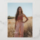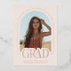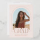 Voici notre faire-part de graduation photo en arc rose roux - un garde-robe moderne et élégant conçu avec une élégance minimaliste. L'avant est ornée d'une photo en forme d'arc avec une fine bordure et le mot "grad" qui recouvre partiellement la photo - toutes deux imprimées en feuille d'or rose authentique pour cette touche de luxe. Le reste du texte est en terre cuite / orange brûlée. Personnalisez le modèle en ajoutant votre année de diplôme, votre nom et votre école pour créer votre faire-part avec facilité. Au verso, téléchargez une photo pleine taille et ajoutez une ligne de signature. © Kimbellished, LLC