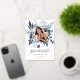Notre faire-part de graduation Wild Azure encadre une photo carré de votre diplômé avec une élégante bordure carré de feuillage d'aquarelle luxuriante dans des tons bleu poussiéreux, avec de véritables garnitures en feuille d'or sur un arrière - plan blanc immaculé. Personnalisez avec le nom de votre diplômé, l'école et l'année de diplôme en dessous. Ajoutez un message personnel à l'arrière, ainsi qu'une photo supplémentaire.
