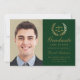 Annoncez votre diplôme de l'école de droit dans le style avec cette élégante carte à plat de graduation photo personnalisée. Ce modèle de design classique présente votre photo (3.5x5) à gauche et à droite est des échelles de justice en faux or avec couronne de laurier et votre nom, diplôme, école et date pour personnaliser sur un arrière - plan vert. Le choix idéal pour ceux qui sortent de l'école de droit. Conçu par l'artiste ©Susan Coffey.