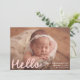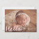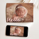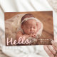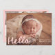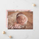 Bienvenue à votre petit avec ce design simple et sucré, avec la photo horizontale de votre bébé avec "Hello" affichée dans une écriture manuscrite rose-rousse douce. Customisez avec le nom de votre bébé, la date de naissance et les statistiques sur le devant, tandis que le dos présente un collage de six photos carrés avec la pièce ci-dessous pour le nom de votre famille ou un court message. Ce design charmant est parfait pour les petites filles et ajoute une touche chaleureuse et tendre à votre grande faire-part.