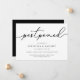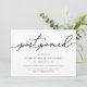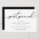 Vous avez besoin de reporter votre mariage ou de modifier la date? Faites-le savoir avec ces cartes de faire-part de report de mariage simples et élégantes. Le design noir et blanc chic est "reporté" en haut dans le script de calligraphie à lettres, avec vos noms et nouvelle date en dessous. Ajustez le libellé et le niveau de détail au besoin. Comme indiqué, un exemple de texte dirige les invités vers votre site Web mariage pour plus d'informations.