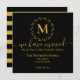 Ce que nous avons déplacé carte faire-part est classe et élégant. Il comprend un arrière - plan noir avec un monogramme de couronne botanique d'or et une typographie de l'or. Des bandes noires et dorées à l'arrière de la faire-part complètent le design.
