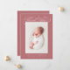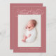 Carte faire-part de naissance simple et minimaliste avec texte typographique qui dit "merci" en style calligraphie. Vous pouvez ajouter une photo à l'avant et à l'arrière. L'arrière - plan est rose.