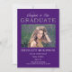 Classy et élégant mais brillant "Félicitations à Notre Diplômé" teinte violet et argent faux design de parties scintillant avec une seule photo sur le devant avec le mot "Félicitations à Notre" dans une police de script inédite et le mot "GRADUATE" dans la fausse parties scintillant argent. Le nom de votre élève, l'école, l'année de classe, la date de remise des diplômes et les plans futurs tombent sous la photo. Le dos est orné d'un faux arrière - plan parties scintillant argenté. Design par Holiday Hearts Designs (droits réservés).