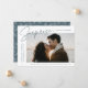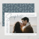 Partagez les nouvelles de votre fiançailles surprise avec ces annonces élégantes de fiançailles photo. Le design comporte l'expression "Surprise, nous nous sommes engagés !" dans un script fumé bleu-gris et des lettres modernes. Votre photo fiançailles est présentée dans la partie centre-droit du design avec vos noms et la date fiançailles affichés à gauche. Personnalisez le faire-part fiançailles surprise en ajoutant des détails supplémentaires ci-dessous tels que la ville/l'état mariage, le site Web mariage, etc. La faire-part inverse pour afficher un motif de feuillage blanc sur un arrière - plan bleu-gris.