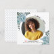 Fleurs bleues Dusty Classe de 2023 graduation photo faire-part. Un joli design qui présente une photo, des fleurs d'aquarelle bleu poussiéreux sur les coins supérieur gauche et inférieur droit, le texte "Classe de 2023" et un capuchon de graduation rose. Le dos comprend un motif à pois en bleu et blanc poussiéreux.