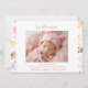 Présentez votre précieuse petite fille au monde avec notre charmant Pastel Flowers Welcome Baby Girl Faire-part de naissance. Cette carte élégante présente un design floral doux et délicat qui encadre délicatement le contenu, évoquant un sentiment de chaleur et de joie. Les couleurs pastel créent un décor apaisant et accueillant, parfait pour célébrer l'arrivée de votre petit. L'avant de la faire-part offre de l'espace pour une photo personnalisable de votre bébé, vous permettant de partager un moment spécial avec votre famille et vos amis. Sous la photo, vous pouvez ajouter le nom de votre bébé, ainsi que la date et l'heure de naissance, la taille et le poids. Cette section fournit tous les détails essentiels dans un agencement joliment aménagé. Au bas de la carte, il y a de la place pour les noms des parents fiers, ajoutant une touche personnelle à cette faire-part sincère.