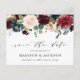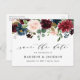 Élégantes cartes de faire-part florales parfaites pour informer vos invités de votre mariage imminent. La carte de faire-part élégante comporte "Sauver la Date" dans un script de calligraphie tendance avec une bordure supérieure de fleurs aquarelles rose pâle, bordeaux et marine avec des feuilles de eucalyptus luxuriantes. Personnalisez la carte postale en ajoutant vos noms, adresse de retour, détails du mariage, site web du mariage, etc.