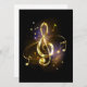 Jewelry, gold, musical treble clef with golden notes and stars on black glowing background.