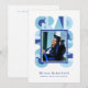Retro-style, yet modern, graduation announcement photo card that features the word "GRAD" designed with geometric shapes in various colors that form a border around the photo of the graduate. Retro colors—blue, teal, white—add to the card's retro style.