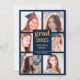 Envoyez à votre famille et à vos amis une carte de graduation personnalisée et moderne pour les wow. Ce design modèle moderne comprend six photos que vous pouvez changer à votre propre encadré en bleu. Dans le centre en or et la typographie blanche est le mot "Grad" avec l'année, votre nom et l'école à personnaliser. Le dos de la carte est bleu. Conçu par Susan Coffey.