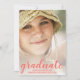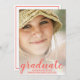 Une simple carte de faire-part de graduation de design de superposition blanche avec votre photo et le texte de script moderne de corail rose, aussi unique que votre diplômé. Le dégradé blanc doux mélangé sur votre photo permet de faire apparaître le texte manuscrit simulé rose. Ces élégantes cartes plates s'inversent en texte rose sur blanc avec une bordure corallienne classique autour du bord de la carte. Ajoutez vos photos et détails de fin d'études pour une invitation personnalisée unique pour un faire-part ou une grande fête qui est parfaite pour les diplômés du collège universitaire ou du lycée.