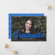 Faire-part de graduation simple et élégante avec la photo horizontale du diplômé avec "Graduate" dans une écriture bleue audacieuse. Personnalisez le faire-part de remise de diplômes photo en ajoutant le nom du diplômé, le nom de l'école et l'année de remise de diplômes. La faire-part s'inverse pour afficher un motif d'arc géométrique bleu et blanc.
