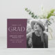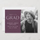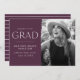Célébrez le jalon excitant de votre diplômé avec ces annonces uniques de diplôme de photographie! Le design comporte des "félicitations à notre diplômée" en lettres modernes blanches avec un arrière - plan violet avec un bord déchiré en bordure de la photo senior du diplômé. Personnalisez le faire-part en ajoutant le nom du diplômé, le nom de l'école et l'année de fin d'études. La carte inverse pour afficher un motif rayé blanc et violet texturé.