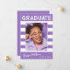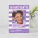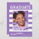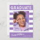Cartes photos de graduation rétro, rayés et tendance, avec des éléments de design de texte rétro avec écriture manuscrite. La photo des diplômés est accentuée de rayures blanches audacieuses. Le dos de la carte offre des espaces de texte personnalisés pour des informations sur votre graduation et votre futur voyage. Écriture blanche sur violet élégant ou customisez facilement l'arrière - plan pour correspondre à la couleur primaire de votre école ou toute couleur de votre choix. Parfait pour les diplômes du lycée, du collège et de l'université.