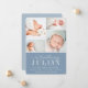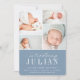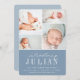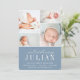 Les annonces de naissance élégantes comportent quatre photos de nouveau-nés disposées dans une grille de montage sur un arrière - plan bleu poussiéreux. "Introduce [name]" apparaît sous le script de calligraphie chic et le lettrage de bloc classique. Personnalisez avec le nom complet du bébé, les statistiques de naissance et une signature de famille en bas. Un design simple et propre et neutre pour annoncer l'arrivée de votre petit.