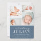 Les annonces de naissance élégantes comportent quatre photos de nouveau-nés disposées dans une grille de montage sur un arrière - plan bleu poussiéreux. "Introduce [name]" apparaît sous le script de calligraphie chic et le lettrage de bloc classique. Personnalisez avec le nom complet du bébé, les statistiques de naissance et une signature de famille en bas. Un design simple et propre et neutre pour annoncer l'arrivée de votre petit.