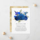 Invitation de mariage avec liste d'invités réduite, fleurs bleues royales et or, typographie élégante personnalisable selon les spécificités de votre événement. En ces temps incertains, il peut arriver que vous deviez organiser un mariage plus petit que prévu initialement. Cette carte d'annonce vous évitera l'embarras et vous soulagera l'esprit ! Vous pouvez en outre offrir la possibilité de se joindre à vous pour une cérémonie virtuelle.