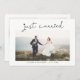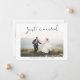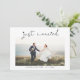 Carte mariage simple et moderne 2 faces avec un script décontracté écrit à la main qui dit "Just Married" sur le dessus de votre photo. Il y a des coeurs dans le texte. Cette carte a 3 photos au total.