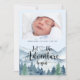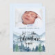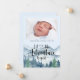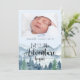 Laissez l'aventure commencer par thème de l'aquarelle bébé faire-part de naissance, avec forêt et montagnes paysage sauvage avec typographie de script de calligraphie avec coeur au milieu. Ajoutez simplement la photo de votre nouveau bébé.