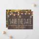 Rustic Fall Lights & Feuilles Enregistrer la date Annonce Carte postale - avec des lumières de mât de jarre remplies de lucioles scintillantes avec guirlande feuillue sur un arrière - plan de grange bois. Une photo du couple heureux figure au dos de la carte. L'annonce parfaite Save the Date pour le couple qui aime le style rustique. Enregistrer la date fera partie d'une collection.