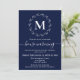 Elégante faire-part de réchauffement de maison bleu marine et invitation de la fête de réchauffement de maison avec une délicate couronne botanique blanche, et monogramme avec typographie blanche. Lignes en diagonale blanches et bleu marine personnalisables sur le dos pour un look moderne préppy.