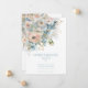 Un bouquet floral moderne et élégant rose pêche et bleu poussiéreux d'aquarelle avec son ombre doucement sur l'invitation et éclaboussant or éclaboussures et éléments, avec vos prénoms dans une police moderne avec une date mariage numérique en dessous et une petite police pour les détails.
