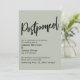 La distinction de cette suite est due à la police de script manuscrite décontractée et audacieuse utilisée pour les phrases d'accent. Si vous êtes en position de devoir informer vos invités mariages que vous avez dû changer de date importante, voici une option simple et audacieuse. Dans cet article, la police de script manuscrite a été utilisée pour créer un graphique simple représentant le mot "Postponed". Utilisez les champs modèles pour ajouter vos détails personnels et faire de ce design moderne votre propre. L'arrière - plan peut être changé en n'importe quelle couleur. Veuillez communiquer avec toute demande spéciale ou customiser de l'aide. // 105 //