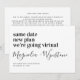 Faites savoir à vos amis et à votre famille les nouveaux plans plus restreints pour votre mariage avec cette annonce de mariage virtuel moderne. Veillez personnaliser le message pour inclure l'adresse web de votre site de mariage. Ou pour leur faire savoir comment ils peuvent assister à votre mariage virtuellement.