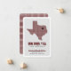 Faites-leur savoir où vous allez avec ce faire-part chic en mouvement. Comprend l'état du Texas dans un motif de grille avec un coeur que vous pouvez déplacer pour montrer où est votre nouvelle maison. Backside dispose d'une version plus grande du même motif carré ou vous pouvez le remplacer par votre photo de famille préférée. Vient en orange brûlé, marron, rouge, drapeau d'état bleu, vert, violet, orange, noir et jaune - la plupart basé sur les couleurs de l'école d'état. Produits correspondants disponibles.