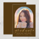 Envoyez à votre famille et à vos amis une carte d'annonce de diplôme photo personnalisée unique pour 2025 pour les épater. Ce modèle de conception moderne présente une photo dans un cadre en arche que vous pouvez modifier à votre guise sur un fond marron. Sous votre photo se trouve le mot "Diplômé" dans une typographie moderne manuscrite fausse or et votre nom, lycée et année à personnaliser. Conçu par Susan Coffey.