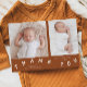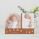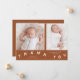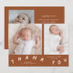 Carte de faire-part de naissance Whimsical avec texte typographique qui dit "merci" en bas avec deux photos sur la police. Vous pouvez ajouter une 3ème image sur le dos avec les statistiques de naissance et le message. l'arrière - plan est en terre cuite.