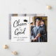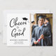 Carte moderne 2 photo graduation faire-part. Sur le devant, la photo de votre diplômé est à côté de "Cheers to the Grad" écrit dans un script moderne avec un grand casquette sur le dessus. Vous pouvez facilement personnaliser avec le nom et l'école de votre diplômé, et ajouter une autre photo au dos.
