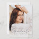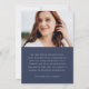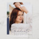 Annoncez les réalisations et les plans de votre diplômé avec ce faire-part de graduation photo moderne et élégant. L'avant du faire-part affiche la photo verticale du diplômé qui saigne complètement. "Graduate" est affiché dans un script de marine manuscrit branché. Personnalisez le faire-part avec l'année d'obtention du diplôme, le nom du diplômé et le nom de l'école. Le faire-part inverse pour afficher une photo supplémentaire avec votre texte personnalisé ci-dessous en lettres blanches avec un arrière - plan de marine solide. Ce faire-part de 2 diplômes photo est parfait pour les diplômes du secondaire ou collégial.