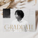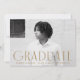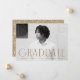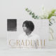 Faire-part de graduation simple avec photo horizontale du diplômé avec "Graduate" en laiton, lettrage art déco moderne. Personnalisez l'avant du faire-part de remise de diplômes en photo unique en ajoutant le nom du diplômé, son école et son année d'études. Le faire-part s'inverse pour afficher un design en laiton et blanc géométrique tourbillon.