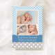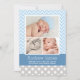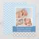 Carte d'annonce de naissance photo audacieuse et ludique avec trois photos de votre bébé garçon encadrées par un motif chevron bleu ciel et blanc élégant. Le nom du bébé apparaît en écriture calligraphique sur une bannière bleu sarcelle avec les informations de naissance et un message "Parents fiers" en blanc. Le dos est habillé d'un motif à pois gris et blanc coordonné. Toutes les couleurs et le texte sont entièrement personnalisables.