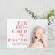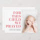 Un design typographique moderne pour annoncer l'arrivée de votre petite fille. Le côté gauche présente une adaptation du verset de la Bible 1er Samuel 1:27 - "Pour cet enfant nous avons prié" en rose gras, avec les détails de naissance de votre petit en rose. Sur le côté droit, téléchargez votre photo préférée de votre précieuse photo. Ce faire-part est parfait pour un arc-en-ciel ou un bébé miracle.