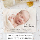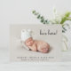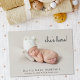 Faire-part de naissance moderne minimale pour annoncer l'arrivée de votre nouveau bébé à la famille et aux amis. La photo de votre nouveau-né remplit le devant et est superposée de "elle est ici !" "il est ici !" ou "Je suis ici !" dans un script contemporain (vous pouvez déplacer ce texte dans une autre zone de la carte en fonction de votre photo en sélectionnant "modifier dans l'outil de design"). Ajoutez son nom, sa date d'arrivée et ses statistiques de naissance. Au contraire, ajoutez quatre photos de famille supplémentaires, un message "accueilli par" et les prénoms des parents et des frères et soeurs.