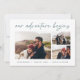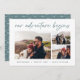 Une carte de faire-part fiançailles moderne et passionnante pour le couple aventurier, cette conception simple et épurée comprend trois photos horizontales ou orientées paysage dans une mise en page de collage grille, avec "notre aventure commence" ci-dessus en écriture manuscrite. Personnalisez avec vos faire-part, noms et détails supplémentaires le long du bas.