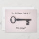 Affiche une clé squelette antique sur un arrière - plan rose. Le texte principal dit "La famille Williams est en mouvement !" et peut être customisé. Les coordonnées au verso peuvent être changées en votre nouvelle adresse. Design minimaliste, propre et féminin. Pour déménager dans une nouvelle maison, avec votre nouvelle adresse, téléphone, numéro et autres coordonnées.