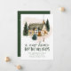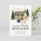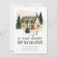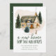 Elégant faire-part de vacances en mouvement avec une maison d'aquarelle confortable entourée de pins enneigés avec un lapin devant. "Une nouvelle maison pour les fêtes" est affiché en lettres vert foncé. Personnalisez le design avec votre nom et adresse. La carte revient à un arrière - plan vert foncé enneigé.