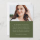 Annoncez les réalisations et les plans de votre diplômé avec ce faire-part de graduation photo moderne et élégant. L'avant du faire-part affiche la photo verticale du diplômé qui saigne complètement. "Graduate" est affiché dans un script vert olive écrit à la main et tendance. Personnalisez le faire-part avec l'année d'obtention du diplôme, le nom du diplômé et le nom de l'école. Le faire-part inverse pour afficher une photo supplémentaire avec votre texte personnalisé ci-dessous en lettres blanches avec un arrière - plan vert olive solide. Ce faire-part de 2 diplômes photo est parfait pour les diplômes du secondaire ou collégial.