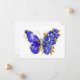 Bijoux, bleu, saphir, papillon aux fleurs pétillantes avec aile décorée de bleu, fleurs précieuses avec feuilles d'or sur arrière - plan blanc.