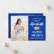 Partagez la joie d'un diplôme d'études secondaires ou collégiales avec ces photos personnalisées bleu royal, or et blanc annonces. (CONSEIL EN MATIÈRE DE PLACEMENT D'IMAGE : Une façon simple de centrer une image exactement comme vous voulez est de la rogner avant de la télécharger sur le site Zazzle.) Ce modèle est simple à customiser avec n'importe quel libellé de votre choix, comme les détails de l'invitation du parti, le nom des parents, les distinctions spéciales, le titre du diplôme, la citation inspirante préférée, les coordonnées du diplômé, les plans d'études futurs ou le nouveau poste. S'il n'y a pas de texte non voulu simplement le supprimer. Le design comprend un arrière - plan à l'ombre bleue, un casquette de tableau de mortier en feuille d'or faux, une calligraphie manuscrite, une typographie minimaliste moderne et une photo de votre choix, comme une image principale ou une image de la cérémonie de début. Veuillez noter que l'or est imprimé en couleur et non en métal. Ces élégantes cartes de faire-part de remise de diplômes sont une façon branchée et chic de partager votre fête spéciale avec votre famille et vos amis. Félicitations au diplômé !