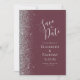Le bord gauche de cet élégant mariage moderne, à l'exception de la carte de date, comporte une bordure en faux parties scintillant argent. Le texte personnalisable associe écriture gris argenté, copperplate et polices italiques sur un arrière - plan bordeaux foncé. L'envers présente un design bordeaux et argenté assorti.